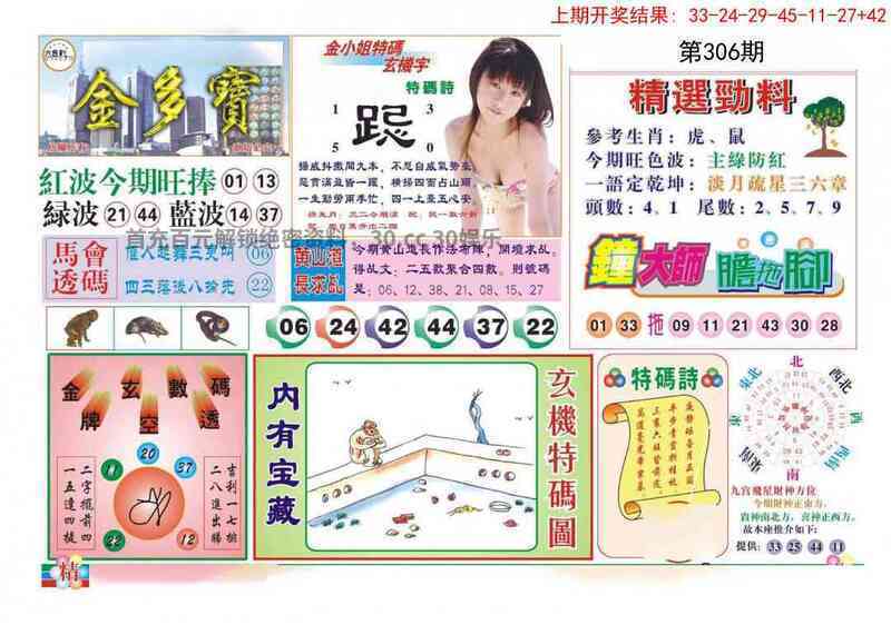 | 309期:金多宝 解:图中一语定乾坤可解心想事成的生肖,龙马蛇鸡鼠狗 综合:龙马蛇鸡鼠狗 防特:33.45.06.18.08.32 |
