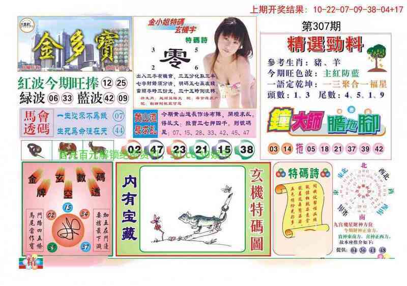 | 308期:金多宝 解:图中一语定乾坤可解人缘极佳的生肖,猪狗兔马鸡猴 综合:猪狗兔马鸡猴 |